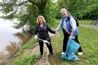Anja Reinhardt (l.) und Monika Beck (r.) sammelten Müll auch im abschüssigen Uferbereich auf.