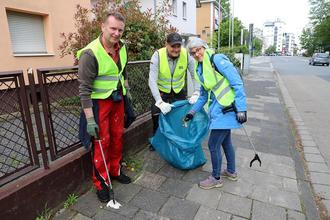 Die Vorsitzende des Kegel- und Bowlingvereins Kelsterbach, Katia Adams (r.) säuberte zusammen mit Frank Hoffmann (l.) und Holger Dama (Mitte) die Mörfelder Straße.