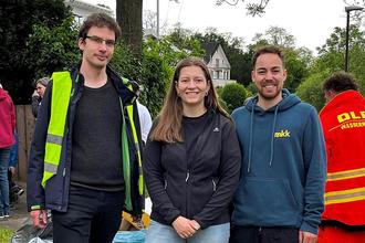 Maximilian Barth (l.) und Lilly Hermann (Mitte) vom Team Wirtschaft & Nachhaltigkeit organisierten den Clean-up-day, Nils Dößereck (r.) von der Krankenkasse mkk bot Plogging an.