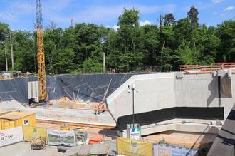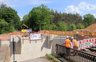 Am Freitag vergangener Woche konnte das Bahn-Projekt Regionaltangente West (RTW) im mittleren Bauabschnitt einen wichtigen Meilenstein feiern. An der B40 bei Kelsterbach wurde eine 3.000 Tonnen schwere Betonbrücke mittels eines hydraulischen Verfahrens auf Verschubschlitten an ihren zukünftigen Standort manövriert. Zweieinhalb Stunden dauerte der Einschub der neuen Brücke, die benötigt wird, da die RTW an dieser Stelle die Bahnstrecke von Frankfurt nach Mainz unterqueren muss. Kelsterbach selbst wird nicht direkt an die RTW angeschlossen. Dennoch war Bürgermeister Manfred Ockel vor Ort, um sich ein Bild von dem Baufortschritt zu machen. Schließlich ist Kelsterbach direkt von den Baumaßnahmen betroffen, wie an dieser Stelle sehr deutlich zu sehen sei, so Ockel.