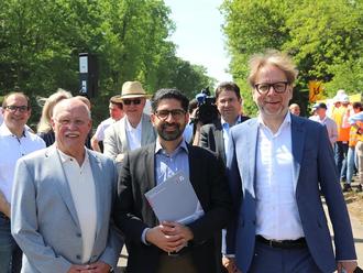 (vordere Reihe, vl.) Horst Amann, Geschäftsführer der RTW Planungsgesellschaft mbH, Minister Kaweh Mansoori und Wolfgang Siefert, Dezernent für Mobilität der Stadt Frankfurt.
