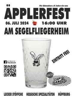 Am 06. Juli feiert der Kulturverein "Die Schnaaken e.V." auf dem Gelände des Segelfliegerheims sein diesjähriges "Äpplerfest". Neben dem obligatorischen "Stöffche" wird es weitere Spezialitäten aus Hessen wie Handkäs' mit und ohne Musik, Rippche vom Grill, Bratwurst usw. geben. Für die grossen & kleinen Kinder wird auch so einiges geboten. Los geht's um 16:00 Uhr und die Schnaaken freuen sich auf Alt & Jung aus Nah & Fern.