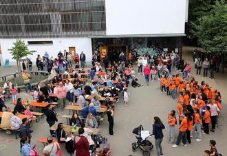 Während die Kinder bis 18 Uhr verschiedene Spielstationen wie Dosenwerfen und Eierlauf ausprobieren, sich unter anderem an einer Button-Maschine kreativ betätigen oder in die Angebote des KelsterLab hineinschnuppern konnten, durften sich alle Interessierten den von Schülerinnen und Schülern der vierten Klassen durchgeführten Führungen durch die Schule anschließen. Dabei ging es über die einzelnen Cluster bis ins Dachgeschoss, wo neben der vor einigen Wochen eröffneten Schulbibliothek „Lesedschungel“ und der weitläufigen Dachterrasse mit beeindruckendem Blick über die Dächer des Unterdorfs auch das ausgebaute Dachgeschoss, das zukünftig unter anderem für die Nachmittagsbetreuung genutzt werden soll, gezeigt wurde. Wer sich danach noch stärken wollte, dem standen in der Aula ein reichhaltiges Kuchenbuffet und in der Mensa verschiedenste herzhafte Spezialitäten – allesamt von der Elternschaft bereitgestellt – zur Verfügung.