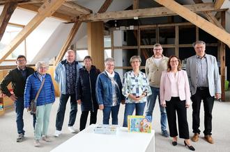Sie schauten sich das ausgebaute Dachgeschoss an: (vl.) Hans-Peter Hamann (stellvertretender Stadtverordnetenvorsteher), Stadträtin Helga Oehne, Erster Stadtrat Kurt Linnert, Silke Gocht-Zimmermann (Staatliches Schulamt), Stadträtin Katja Ehrlich, die ehemalige Schulleiterin Gerlinde Louis, Architekt Bernd Erik Wiegand, Schulleiterin Simone Wilhelm sowie Bürgermeister Manfred Ockel.