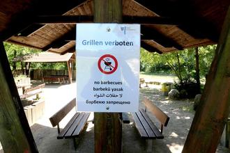 Mehrsprachige Hinweisschilder weisen auf das Grillverbot hin