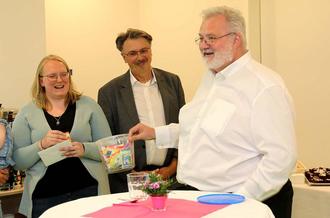 Pfarrer Stefan Barton (r) verteilte prickelnde Brause, über die sich auch Einrichtungsleiterin Katharina Plitt-Köhlhofer (l) und Bürgermeister Manfred Ockel freuten.