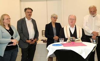 (vl.) Einrichtungsleiterin Katharina Plitt-Köhlhofer, Bürgermeister Manfred Ockel, Christiane Leonhardt-Icten, Direktorin des Caritasverbands Offenbach, Pfarrer Franz-Josef Berbner und Pfarrer Stefan Barton bei der Segnung der neuen Kita.