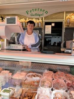 Wir kommen aus der Nähe von Hühnfeld und seit ungefähr sieben Jahren auf den Kelsterbacher Markt. Uns gefällt es sehr gut hier. Wir verkaufen Nudeln, Eier, Geflügel, zur Wildzeit ab September Wild und Lamm, außerdem Hausmacher-Salate, wie Fleischsalat oder Geflügelsalat und Eiersalat und selbstgemachten Kochkäse.