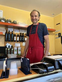 Rainer Kleber verkauft an seinem Feinkoststand mediterrane Köstlichkeiten und überbrückt so die Zeit bis zum nächsten Urlaub in den Süden.