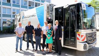 Ammann und sein Kollege Pascal Wunderlich erklärten Ockel dann bei einer genauen Präsentation des Fahrzeugs, wo neben dem emissionsfreien Antrieb die weiteren Vorteile liegen. Da im Bereich des Fahrerhauses, das Platz für vier Personen bietet und das mit nur zwei Stufen einen deutlich komfortableren Ein- und Ausstieg ermöglicht, kein Verbrennungsmotor mehr integriert ist, wird dieses gerade im Sommer nicht mehr so heiß, wie das bei herkömmlichen Müllfahrzeugen der Fall ist.