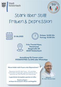 In einer Kooperationsveranstaltung nehmen sich die Stadt Kelsterbach sowie Asamira Thies, die den Deutsch-Marokkanischen Frauenkompetenzverein Kaftaat gegründet hat, dem schwierigen Thema Depression an. Bei der Veranstaltung am Samstag, 21. Juni, im Fritz-Treutel-Haus werden gezielt Frauen angesprochen. Denn Frauen leiden nicht nur anders unter Depressionen als Männer – sie leiden auch oft still.