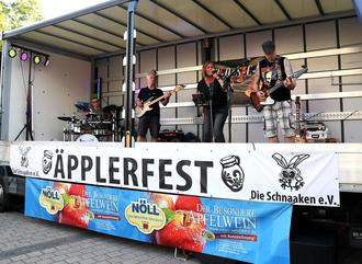 Am Rathaus Neubau erfuhr die Ladefläche des LKWs, der von den Schnaaken schon des Öfteren für den Kerwe-Umzug genutzt wurde, anlässlich des aktuellen Äpplerfests eine förderliche Zweckerweiterung. Sie diente ab 19 Uhr der Band Rosch aus Taunusstein als Bühne. Das Quintett musste aufgrund der Erkrankung eines Bandmitglieds in reduzierter Besetzung auftreten. Dies tat der guten Stimmung, die sie mit Cover-Versionen verschiedener Rock-Klassiker und Pop-Hits etablierten, keinen Abbruch. Songs wie Queens „Another one bites the dust“, „Because the Night“ von Bruce Springsteen, Lynyrd Skynyrds Hymne „Sweet Home Alabama“ oder der Mega-Hit „Get Lucky“ – dargeboten in einer mitreißenden Rock-Version – lieferten die perfekte Untermalung für das fröhliche Beisammensein der Festbesucher. Für Frontfrau Sonja Redweik war der Auftritt einmal mehr ein Heimspiel, da die Kelsterbacherin schon lange bei den Schnaaken aktiv war, bevor sie ihr Gesangstalent regelmäßig bei Auftritten der Band Rosch unter Beweis stellte.