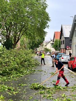 Aufräumarbeiten auf der Mainstraße nach dem Sturm.