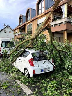 Am Donnerstag vergangener Woche sorgte das Sturmtief „Lambert“ in Teilen Deutschlands für Unwetter mit Starkregen und Orkanböen, die auch in Kelsterbach ihre Spuren hinterlassen haben. Zum Glück wurden keine Personenschäden gemeldet, dafür sorgte der Sturm aber innerhalb weniger Minuten für einigen Sachschaden: So fiel in der Staufenstraße ein großer Baum direkt auf einen geparkten Kleinwagen und beschädigte zudem das Dach sowie die Fassade eines angrenzenden Wohnhauses. Auch in der Mainstraße krachte ein abgebrochener großer Ast auf ein abgestelltes Auto. Außerdem wurden von einigen Dächern Ziegel losgerissen. In der gesamten Kelsterbacher Gemarkung wurden etliche Bäume vom Sturm beschädigt oder ganz umgerissen.