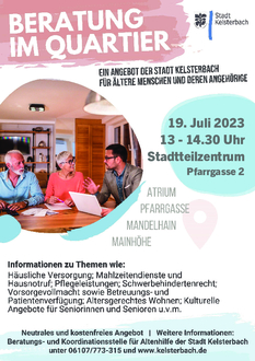 Seit Juli offeriert die städtische Altenhilfe den Kelsterbacher Seniorinnen und Senioren sowie deren Bezugspersonen ihr neues Beratungsangebot im Quartier. Der nächste Beratungstermin ist Mittwoch, 19. Juli, 13 Uhr bis 14.30 Uhr. Volker Brambilla informiert im Stadtteilzentrum in der Pfarrgasse 2 zu allen Themen rund ums Älterwerden.