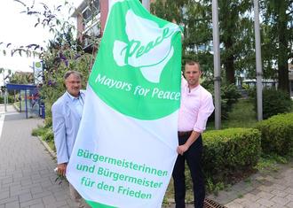 Am Montag trafen sich Kelsterbachs Bürgermeister Manfred Ockel und sein Raunheimer Kollege David Rendel, um gemeinsam ein sichtbares Zeichen für den Frieden zu setzen. Anlässlich des Mayors-for-Peace-Flaggentags hissten die beiden Bürgermeister die Flagge der 1982 vom damaligen Bürgermeister von Hiroshima, Takeshi Araki, gegründeten Organisation. Sie ist ein Zusammenschluss der Bürgermeisterinnen und Bürgermeister von Städten und Kommunen verschiedener Länder, die sich für eine friedliche Welt ohne Atomwaffen einsetzen. Nachdem Rüsselsheim bereits 2019 den Mayors for Peace beigetreten ist, haben sich nun auch Kelsterbach und Raunheim angeschlossen. Damit sind alle Kommunen des „Drei-Gewinnt“ Bündnisses Teil der Initiative.