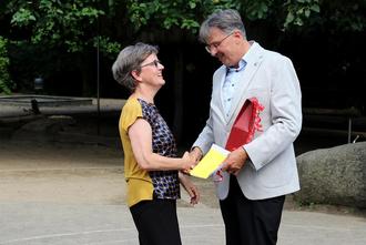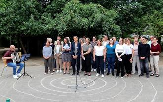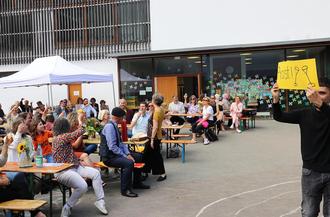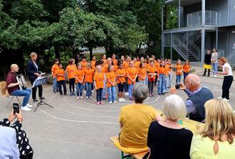 Barbara Jühe, Leiterin der Integrierten Ganztagsschule (IGS), dankte bei S wie Schulverbund ihrer Kollegin für die stets gute Zusammenarbeit. Verlässlichkeit und Genauigkeit zeichneten sie aus, so Jühe. Zum Ende des offiziellen Teils der Feier wurde es noch einmal musikalisch, als das Kollegium, erneut begleitet von Marc Fischer, zu guter Letzt eine eigene Version des Chansons „Oh Champs-Élysées“ zum Besten gab. Louis zeigte sich gerührt und begeistert von der Kreativität und der Herzlichkeit dieser Feier: „Die Kolleginnen und Kollegen haben das genau so gemacht, wie ich es mag. Einfach toll.“