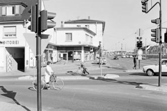 Ein Bild vom Oktober 1973 zeigt die recht neue Verkehrsregelung am noch im Betrieb befindlichen Bahnübergang von der Mörfelder Straße hin zur Bergstraße. Die zu sehende Ampelanlage, die Anfang der 1970er Jahre installiert wurde, galt seiner Zeit als die modernste Lichtzeichenanlage in Deutschland. Sie regelte sowohl den Verkehr zwischen der Frankfurter Straße, Rüsselsheimer Straße und Bergstraße, als auch die des Bahnübergangs. Heute sind der Bahnübergang und die Ampelanlage schon lange wieder Geschichte, ebenso wie die Wäscherei Röver im Hintergrund. Geblieben ist ein moderner Kreisel, der nun den Verkehrsfluss erfolgreich regelt. (Text/Bild: Schönstein/Siebart)