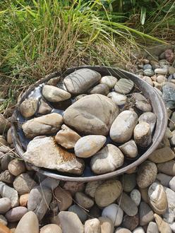 Nicht spektakulär aber hilfreich - ein einfacher Blumenuntersetzer mit Steinen und Wasser befüllt dient als Bienentränke.
