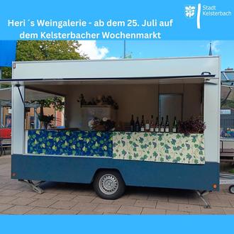 Ab dem kommenden Freitag wird der Kelsterbacher Wochenmarkt um einen neuen Stand ergänzt. Mit Heri ´s Weingalerie hat nun auch Kelsterbach einen Weinstand. Neben verschiedenen deutschen und internationalen Weinen werden auch Sekte und Kaffee angeboten sowie Glühwein im Winter.