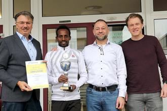 Bürgermeister Manfred Ockel (l.) gratulierte Moges Dargie Mengesha (2.v.l.) zu dessen sportlichen Erfolg, mit ihm freuen sich Trainer Mohamed Sabbagh (2.v.r.) und TuS-Vorsitzender Thorsten Fern (r.)