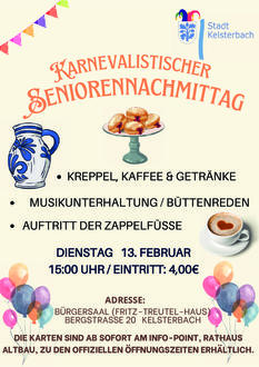 Der Kartenvorverkauf beginnt am Freitag, 19. Januar, am Info-Point im Rathaus-Altbau. Dort sind die Karten bis Montag, 12. Februar, erhältlich, am Veranstaltungstag ab 14 Uhr an der Tageskasse. Das Kulturamt der Stadt Kelsterbach freut sich, Sie am Kreppelnachmittag begrüßen zu dürfen.