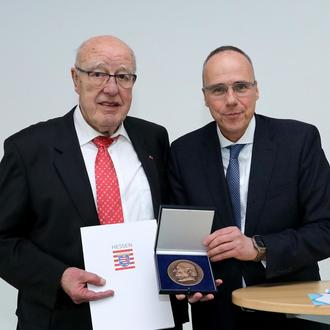 Jürgen Zeller (l.) wurde von Staatsminister Peter Beuth mit der Freiherr-vom-Stein-Plakette ausgezeichnet,
