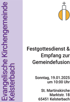 Diese Fusion wurde am 1. Januar 2025 vollzogen. Aus diesem Anlass lädt die neue Evangelische Kirchengemeinde Kelsterbach am Sonntag, den 19. Januar 2025, zu einem Festgottesdienst in die St. Martinskirche ein. Der Gottesdienst beginnt um 10:00 Uhr. Im Anschluss, ab 11:00 Uhr, findet ein Neujahrsempfang mit einer Gemeindeversammlung im Gemeindehaus „Haus Feste Burg“ in der Pfarrgasse 4 statt.