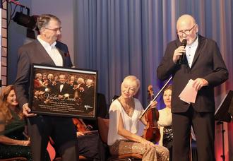 Bevor die Stimmung im Saal durch die schon obligatorische Zugabe auf einen letzten Höhepunkt zusteuerte, richtete Linnert noch einige Dankesworte in Richtung Rainer Zagovec. Mit seinem fundamentalen Wissen über Komponisten und deren Lieder sowie seinen zahlreichen amüsanten Anekdoten habe er das Kelsterbacher Publikum über viele Jahre begeistert. Das kleine Geschenk, mit dem er und Bürgermeister Ockel den langjährigen Moderator des Neujahrskonzerts in den wohlverdienten Ruhestand verabschieden wollten – ein Bild, das Zagovec als Dirigenten, umgeben von unsterblichen Komponisten-Größen wie Bach, Beethoven, Mozart, Brahms, Vivaldi und Tschaikowski zeigt –, nahm stellvertretend dessen Sohn Rafael entgegen. Der tosende Applaus, der auf den abschließenden Radetzky-Marsch folgte, galt dann auch nicht nur den erstklassigen Musikerinnen und Musikern, sondern auch Rainer Zagovec. (sb)