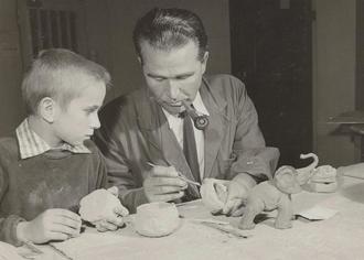 Ein Bild vom 27. September 1957 zeigt einen Jungen, der interessiert einem Herren mit Pfeife zuschaut, wie er ein Werkstück aus Ton bearbeitet. An besagtem Tag machten einige Kinder und Jugendliche von Glanzstoffmitarbeitern einen Ausflug nach Frankfurt in die Räumlichkeiten der Neuwerkgesellschaft. Diese Gesellschaft verfolgte das Prinzip „Erholung von der Arbeit durch Arbeit“. In den Werksstuben konnten Jung und Alt, Mann und Frau oder Schüler und Arbeiter und alle anderen dazwischen allen erdenklichen Handarbeiten nachgehen – ob mit Holz, Ton oder einem anderen Werkstoff. Hergestellt wurden unter anderem Puppen, Flugzeuge, Mosaike, Tischlerarbeiten und Gegenstände aus Ton. Wer noch ein bisschen mehr über die damalige Neuwerkgesellschaft wissen möchte, kann sich in der ARD-Mediathek einen kurzen Film (Werken und Handarbeit vom 15. März 1958) darüber ansehen. In diesem Film ist auch besagter Herr mit Pfeife zu sehen, dort als Werkslehrer bezeichnet.