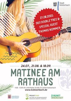 Am Sonntag, 21. August, geht die Veranstaltung Matinee am Rathaus in die zweite Runde. Doch was ist die Matinee am Rathaus und was erwartet Besucherinnen und Besucher auf dem Rathausplatz? Die Stadt Kelsterbach präsentiert im Rahmen des Förderprogramms Zukunft Innenstadt von Juli bis Oktober einmal im Monat die kleine Kulturreihe auf dem Vorplatz der Stadtverwaltung. Am 21. August, zwischen 11 und 13 Uhr, ist es wieder möglich, mit Freunden und Familie locker, fröhlich und musikalisch in den Sonntag zu starten. Dieses Mal auf der Bühne: Das Duo Doubletree & Special Guest Thomas Wimmer. Mit Ihrem Best-of der beliebtesten Acoustic-Popsongs aus den letzten Jahrzehnten grooven sich die Musiker mit Gitarre, Kontrabass, Saxofon, Klarinette und Percussion in die Herzen der Besucherinnen und Besucher. Bei einer Bratwurst oder einer frischen Brezel mit einem kühlen Getränk steht einem tollen Sonntagvormittag nichts mehr im Wege. Der Eintritt ist frei. (rs)