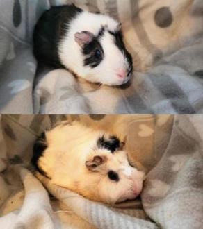Julia (oben) und Florence (unten) kamen im Mai 2024 zu Meerschweinchen in Not e.V. und staunten nicht schlecht – so viele andere Meerschweinchen! Die beiden dreijährigen Meerschweinchen-Damen wollten vor allem unbedingt einen Meerschweinchen-Kastraten kennenlernen und sind sich nun sicher: So einen netten Herren, der sich um alles kümmert, möchten sie in ihrem neuen Zuhause auch. Ansonsten sind Florence und Julia einfach gespannt, was im neuen Heim auf sie zukommt, und können sich sowohl vorstellen, zusammen zu einem Kastraten zu ziehen als auch jede für sich zu einem Kastraten und einem anderen Weibchen.