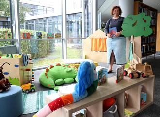 Bibliotheksleiterin Meike Betzold präsentiert die neue Leseecke für die ganz jungen Bibliotheksbesucher.