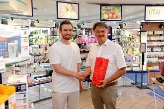 Bürgermeister Manfred Ockel besuchte Anfang der Woche die Kronen-Apotheke in der Rudolf-Breitscheid-Straße 25, um Tristan Gesing zum vor kurzem bestandenen dritten Staatsexamen im Rahmen seines Pharmaziestudiums an der Universität Mainz zu gratulieren, das ihn befähigt, als Apotheker zu arbeiten.