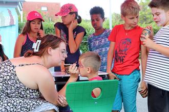 Am Ende einer Woche waren zum Abschluss immer die Eltern zum sogenannten Jahrmarkt eingeladen, um mit den Kindern zusammen verschiedene Spiele auszuprobieren oder die gebastelten Gegenstände präsentiert zu bekommen. Eine Runde Hüpfball- oder Dreibeinrennen mit Mama oder Papa sorgte jedenfalls bei vielen Kindern für großen Spaß. Den hatten sie auch am Slush-Eis, das vor Ort aus Trauben- beziehungsweise Multivitaminsaft hergestellt wurde und reißenden Absatz fand - genau wie die Waffeln, die frisch gebacken wurden. Stets dicht belagert war auch der Stand, an dem sich die Kinder fantasievoll schminken lassen konnten. (wö)