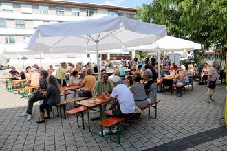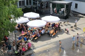 Der Rathausplatz war bei freiem Eintritt stets gut bevölkert und die Sitzgelegenheiten - sowohl die Bierzelttische als auch die bequemen Liegestühle - meist ausgelastet. Für Schatten sorgten große Sonnenschirme, Abkühlung in Form von kühlen Getränken gab es am Verpflegungsstand, wo der Partyservice auch Bratwürste sowie Spundekäs‘ und Brezeln gegen um die Mittagszeit aufkommendes Hungergefühl bereithielt.