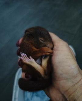 In der Nacht zum Dienstag (13.08.) entdeckte eine Streife der Polizeistation Kelsterbach vor dem Polizeigebäude ein Eichhörnchen-Baby. Das offensichtlich verletzte Eichhörnchen war vermutlich erst kurz zuvor aus seinem Nest unter dem Dach der Polizeistation gefallen.