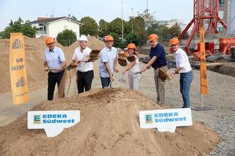 Am vergangenen Freitag wurde mit dem ersten Spatenstich der Startschuss zum Bau des neuen Edeka-Marktes in der Straße Am Südpark gegeben. Neben dem Edeka-Regionalleiter Expansion Nord, Matthias Lein, griffen Kelsterbachs Bürgermeister Manfred Ockel, der Bauausschussvorsitzende Jürgen Zeller, Bauleiter Max Kunkel sowie Yvonne und Johann-Georg Helfrich, die den Markt betreiben werden, zum Spaten, um den symbolischen Akt zu vollziehen.