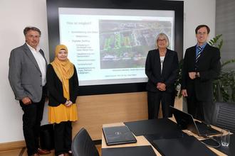 Gaben den Startschuss für die Erarbeitung der Datenplattform (v.l.n.r.): Bürgermeister Manfred Ockel, Yasmina Tajja (HSRM), Dr. Angelika Niederberger (Wirtschaftsförderung Stadt Kelsterbach), Prof. Dr.-Ing. Ludger Martin (HSRM).
