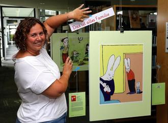 Familie war schon immer ein wichtiger thematischer Bestandteil von Bilderbüchern. Doch die Zeiten, in denen Kindern dort nur ein sehr traditionelles Familienbild präsentiert wurde, sind lange vorbei. Es haben sich in den vergangenen Jahrzehnten neue Formen familiären Zusammenlebens entwickelt, die auch in Kinderbüchern Einzug gehalten haben. Dabei werden nicht nur unterschiedliche Familienkonstellationen, sondern auch verschiedene Lebenssituationen behandelt. Die Wanderausstellung „Alles Familie!“, die von der Internationalen Jugendbibliothek Schloss Blutenburg in München erstellt wurde, zeigt anhand einer Auswahl aktueller Bilderbücher, wie vielseitig Kindern heute das Thema Familie vermittelt wird. Noch bis zum 6. Oktober kann sie in der Stadt- und Schulbibliothek besucht werden. Es ist die zweite Ausstellung, die sich speziell an Kinder und Familien richtet. Den Anfang machte im vergangenen Jahr die Märchenausstellung „Hinter den sieben Bergen“, die sehr gut angenommen wurde. „Alleine 13 Grundschulklassen haben sich die Ausstellung angesehen“, so Bibliotheksleiterin Meike Betzold. Aufgrund des hohen Zuspruchs werden auch in diesem Jahr gezielt Klassen der Kelsterbacher Grundschulen eingeladen. „Alles Familie!“ steht aber natürlich auch allen anderen Bibliotheksbesuchern offen. Zu sehen sind 24 Drucke aus ausgewählten Bilderbüchern, die durch kleine Infotafeln zu den jeweiligen Werken ergänzt werden. Philip Waechter etwa nimmt die kleinen und großen Ausstellungsbesucher mit auf einen Camping-Urlaub ans Meer, bei dem Tim und seine Familie jede Menge Komisches erleben. In „Babyfratz“ von Stephanie Blake muss sich der kleine Hase Simon nach der Geburt seines Geschwisterchens erst einmal daran gewöhnen, dass sich die Welt seiner Eltern nicht mehr nur um ihn dreht. Jutta Bauer zeigt in „Schreimutter“, wie Kinder es erleben, wenn auch die liebevollste Mutter irgendwann einmal ausrastet. Und während „Wie heiraten eigentlich Trockennasenaffen?“ von Ina Voigt (Text) und Jacky Gleich (Illustrationen) vom Alltag eines Jungen mit zwei Müttern berichtet, behandelt Peter Carnavas in „Die wichtigen Dinge“ auf sensible Art den Verlust eines Elternteils. Es ist diese Vielfalt, die Betzold dazu bewegt hat, die Wanderausstellung nach Kelsterbach zu holen.