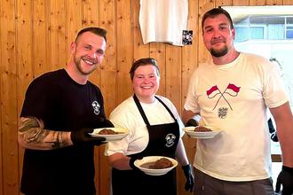 Florian Greiner, Nadja Schmitt und Carsten Klang (v.l.) servierten die deftigen Frikadellen.