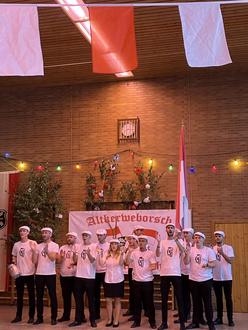 Beim Hackfleischessen zum Auftakt der Kerwesaison am vergangenen Freitag gab es die traditionelle Fleischfrikadelle mit Zwiebelsoße. Rund 110 Teilnehmende bestehend aus Altkerweborsch, Kerweborsch, Alt- und amtierendem Giggelsmädchen sowie weiteren Gästen kamen in die Mehrzweckhalle Nord. Dort hielten die aktuell 17 Mann starken aktiven Kerweborsch ihren ersten Einmarsch in diesem Jahr. Auch Ehrenkerweborsch waren anwesend, darunter die Migrationsbeauftragte Agneta Becker und die Ehrenstadträtin Helga Oehne. Es war wieder einmal ein geselliger Abend, der Generationen verband.
