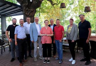 (vlnr) Sven Wellinger (zweiter Vorsitzender der SPD Kelsterbach), Thorsten Siehr (Bürgermeister Ginsheim-Gustavsburg), Thomas Schell (Mitglied des Kreistages Groß-Gerau), Bernhard Daldrup (Bundestagsabgeordneter), Melanie Wegling (Bundestagsabgeordnete für den Kreis Groß-Gerau), Marcus Merkel (Bürgermeister Büttelborn), Landrat Thomas Will, Kerstin Geis (Abgeordnete des Hessischen Landtags) und Bürgermeister Manfred Ockel diskutierten über die Kommunalfinanzen.
