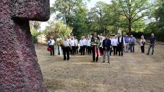 An dem großen steinernen Kreuz auf dem Ehrenfriedhof legten Germann und Ockel Blumengestecke nieder.