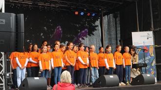 Den Beginn auf der großen Bühne am Marktplatz machte am Samstagnachmittag der Schülerchor der Bürgermeister-Hardt-Schule. Die Mädchen und Jungen der zweiten bis vierten Klasse trugen einheitliche, orange T-Shirts und sechs deutschsprachige Lieder vor. Mit sichtlich Spaß sangen sie ein Begrüßungslied für die neuen Erstklässler oder auch Pipi Langstrumpfs Klassiker „Faulsein ist wunderschön“, das sie im Anschluss noch einmal als Zugabe brachten. Nicht nur die anwesenden Familien waren begeistert und klatschten anhaltend Beifall. Unterstützt wurden die Schüler von ihrer neuen Klavierbegleitung, der Musikschuldozentin Tamara Spendel. Geleitet wird der Schülerchor von Alexandra Gölz und Simone Wilhelm von der Bürgermeister-Hardt-Schule.