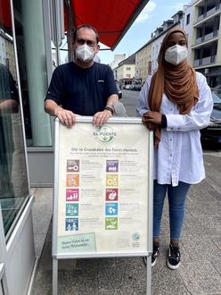 Faitrade-Beauftragter Thorsten Schreiner und die Fairtrade-Praktikantin Muna Mahamad beim nachhaltigen Einkauf.