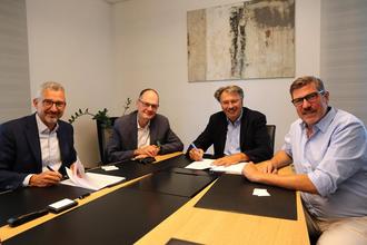 Auf gute Zusammenarbeit – Peter Hartmann (l) und Thomas Kahmann von Hochtief unterzeichnen mit Bürgermeister Manfred Ockel und Stadtrat Bernd Erik Wiegand den Generalunternehmervertrag für den Neubau der KTS.