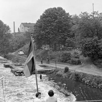 Bevor es die „neue“ und „moderne“ Schiffsanlegestelle am Parkplatz an der Mainstraße gab, wurde man an einem eher provisorisch wirkenden Anleger eingeschifft. Dieser lag dort, wo heute der Kerosinhafen ist, also an der alten Schleusenkammer. Blickt man etwas genauer hin, so kann man in der Bildmitte die ehemalige Gaststätte „Zur alten Schleuse“ mit ihrem Biergarten ausmachen, die ihrerzeit ein beliebtes Ausflugsziel am Ortsausgang von Kelsterbach war. Das Haus, das sich links oben am Ende des Fahnenmastes befindet, war Haus-Nr. 173 der Rüsselsheimer Straße und gehörte zu jenen Häuserblocks, welche vor nicht all zu langer Zeit abgerissen wurden. Das Bild ist aus dem Jahr 1961 und zeigt vermutlich die Abfahrt eines Ausflugsdampfers. (Text/Bilder: Schönstein/Stadtarchiv)
