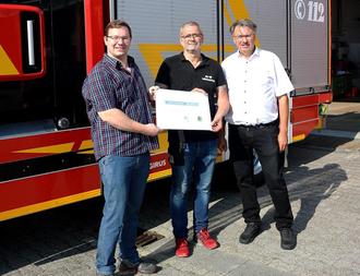 (v.l.) Christian Rolle, Leiter der Freiwilligen Feuewehr Kelsterbach, XY Helfrich, Inhaber des Edeka-Marktes, und Bürgermeister Manfred Ockel bei der Scheckübergabe vor der Feuerwehrwache