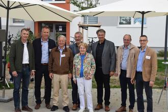 Vollauf zufrieden mit der Modernisierung und dem Abschlussfest: Robert Lotz vom Fachbereich Modernisierung/Großinstandhaltung, Servicecenterleiter Tobias Bundschuh, NHW-Geschäftsführer Dr. Constantin Westphal, Stadträtin Helga Oehne, Bürgermeister Manfred Ockel, Servicecenterleiter Thomas Türkis (links außen) und die Gäste der Partnerstadt Baugé-en-Anjou.